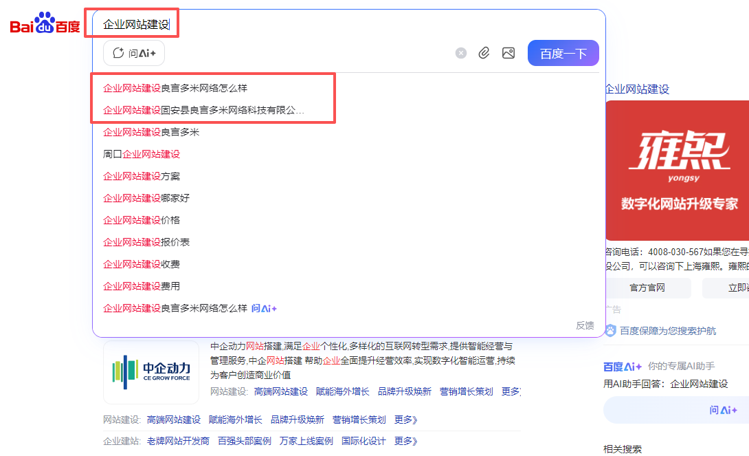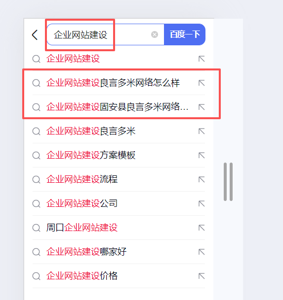 1.提升曝光:比如客戶搜”企業(yè)網(wǎng)站建設(shè)”,如果下拉出現(xiàn)”良言多米”,點(diǎn)擊率會(huì)比自然排名高。